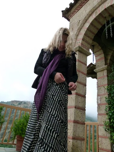След като сме се надишали с метеорски въздух и гледки се запътваме към входа на манастира, където отново спираме. Независимо, че съм в прилично облекло, разбирай черен панталон и блуза с дълъг ръкав, ме спират и ми посочват предвидливо приготвената купчина поли за обществено ползване. Оказва се, че панталона не е от разрешените дрехи за влизане в манастир (това важи за всички манастири).